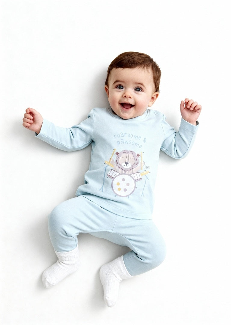 HOP Baby brings music and mischief together with this mint cotton set. The crew neck t-shirt features an adorable lion-on-drums print, adding playful energy to everyday wear. Paired with matching pants, it offers stretch and comfort for wriggling, crawling, and cozy naps. Crafted in breathable fabric and finished with snap buttons at the shoulder, it keeps dressing effortless for parents.