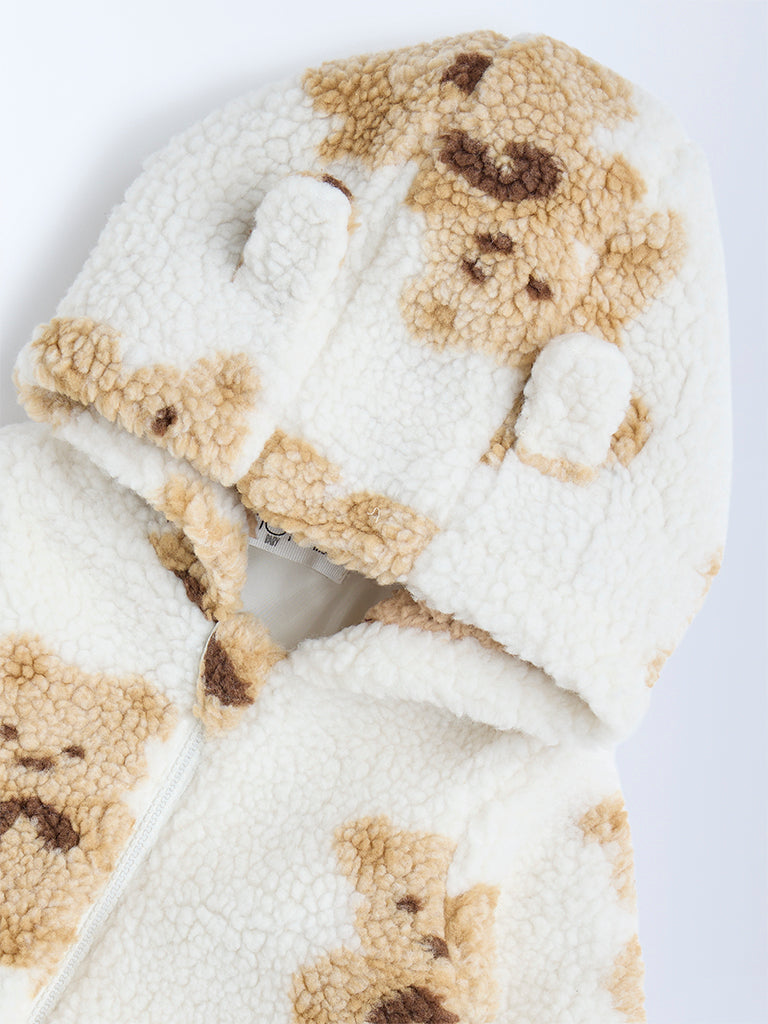 HOP Baby presents this off-white faux fur sweater patterned with adorable teddy motifs all over. It is designed with a hood featuring cute ears and a front zipper closure. Made from a premium-blend fabric that feels soft against the skin, this cosy layer brings comfort and playful charm to cooler days.
