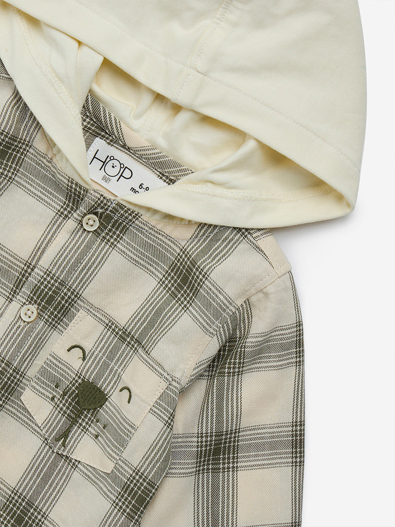 This olive shirt by HOP Baby showcases checkered prints. Made from pure-cotton, it includes a hood that extends to a button placket and full sleeves. The dog-printed pocket adds playful appeal.