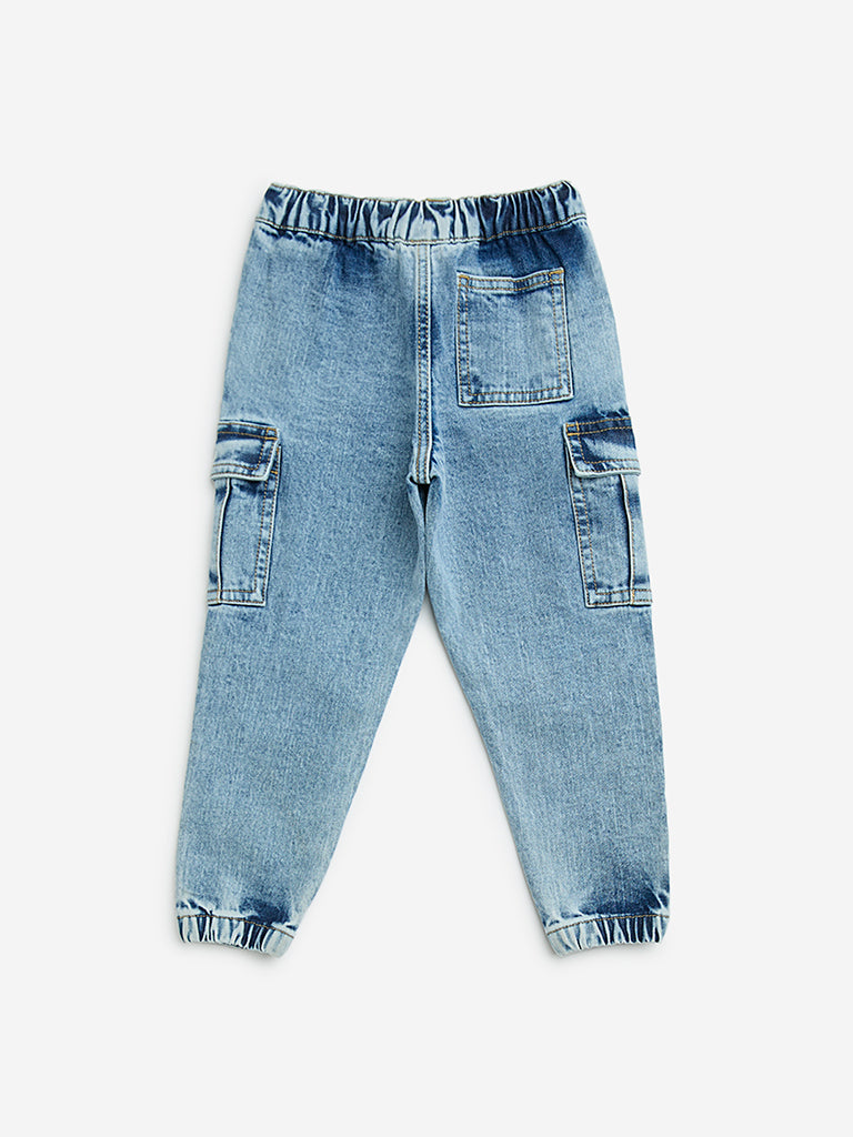 HOP Kids presents these blue jogger-style jeans, crafted from a soft and stretchable cotton blend for all-day comfort. Designed with a mid-rise fit, they feature an elasticated waistband for a secure feel. Multiple chunky pockets and distinctive ridge detailing add a trendy, utilitarian touch.