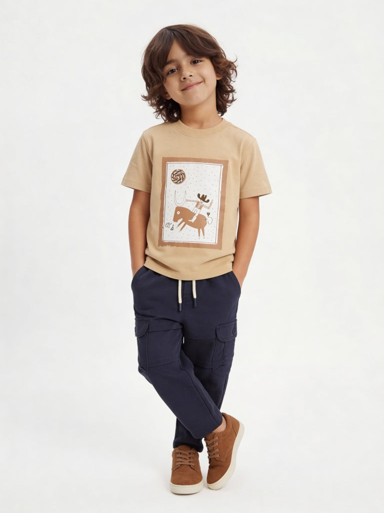 A hint of western fun defines this beige t-shirt by HOP Kids. Designed with a classic crew neck and short sleeves, it features a playful cowboy graphic at the front. Made from pure cotton, it’s an easy, comfortable choice for all-day wear.