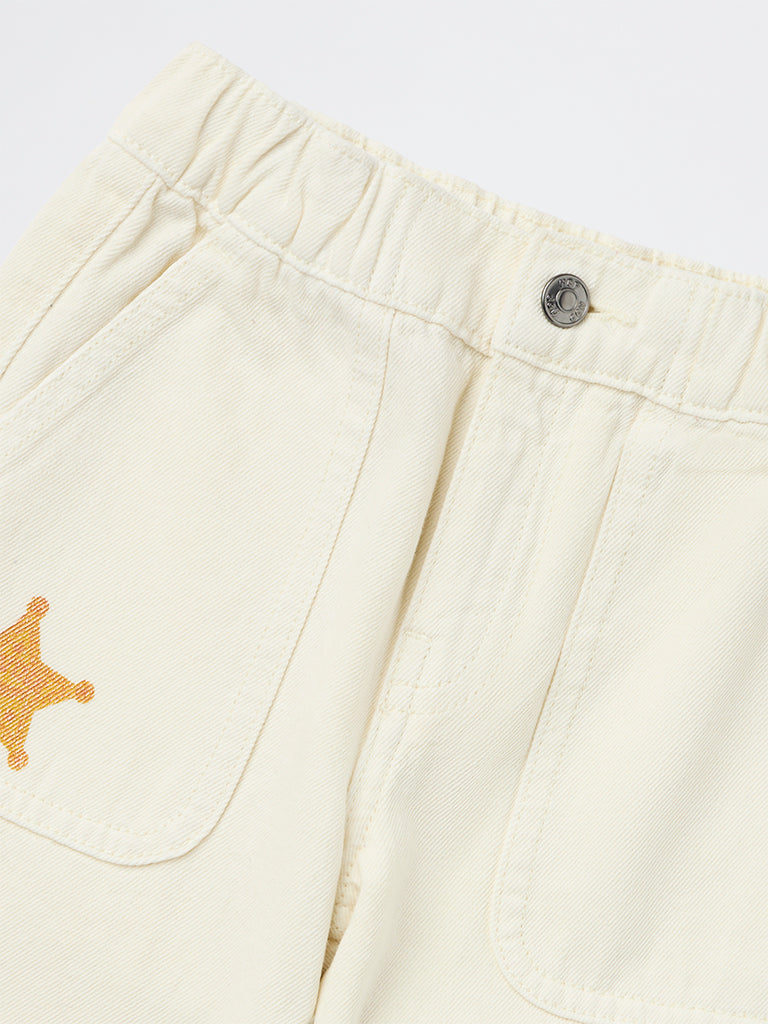 These off-white jeans by HOP Kids are designed with a comfortable mid-rise and an elasticated waistline, finished with a button and zipper closure for a secure fit. Featuring roomy front and back pockets, they are accented with playful animal prints for added charm. Practical yet fun, they are ideal for everyday wear and casual outings.