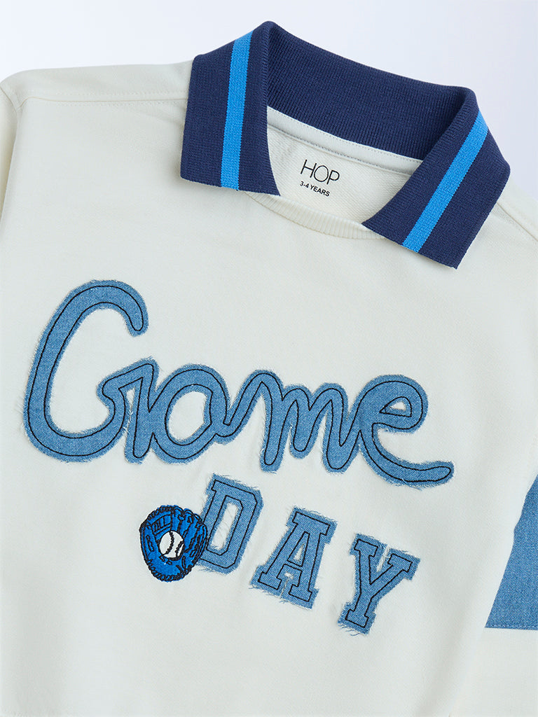 A cozy twist on casual cool, this off-white sweatshirt from HOP Kids stands out with stylised text embroidery on a cotton-rich fabric. Designed with a contrast spread collar and full sleeves, it’s the perfect blend of comfort and style for relaxed winter days.