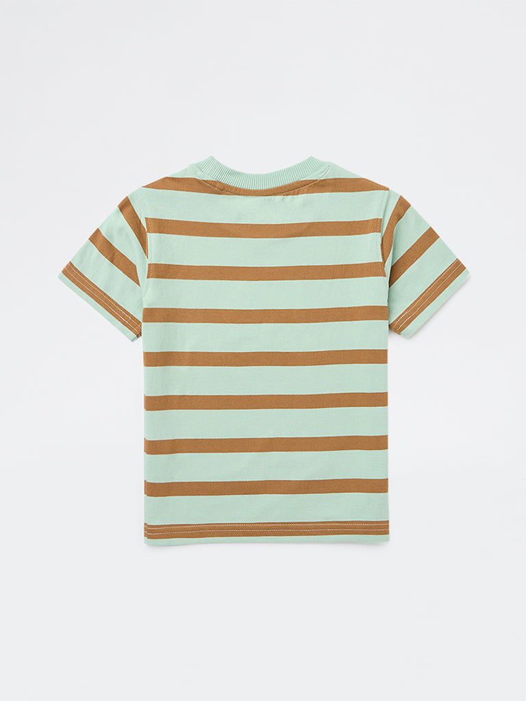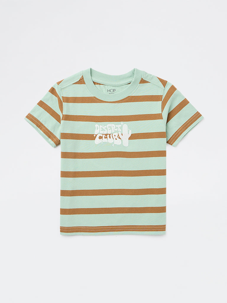 This sage striped t-shirt from HOP Kids adds an easy rhythm to everyday dressing, finished with a bold text motif across the front. Crafted from pure cotton, it offers a soft, breathable feel. A classic crew neckline and short sleeves keep it comfortable for play, school, and weekend plans.