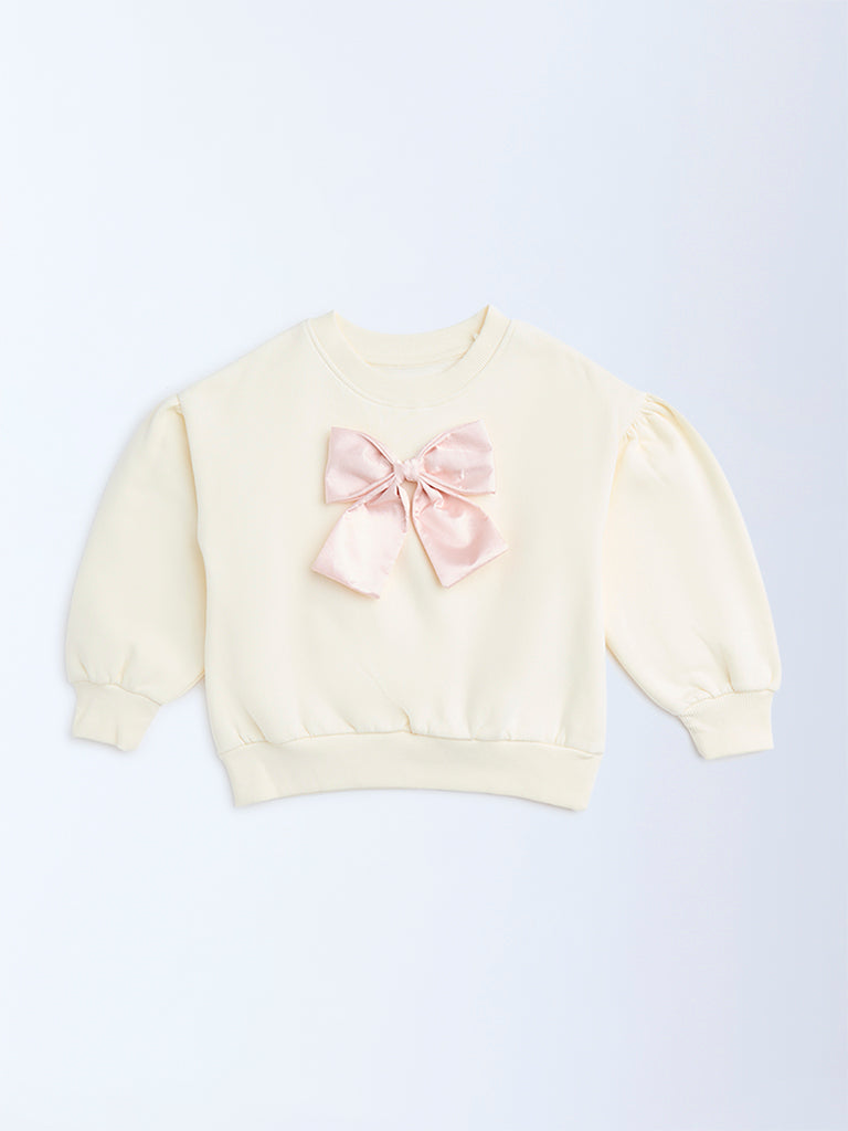 Sweet and cozy, this cream sweatshirt by HOP Kids adds a touch of charm to casual days. The front is finished with an adorable bow that kids will love, while the lightweight fabric keeps them comfy through playtime. Complete with a crew neck, full sleeves, and an elasticated hem, it’s a snug essential for everyday fun.