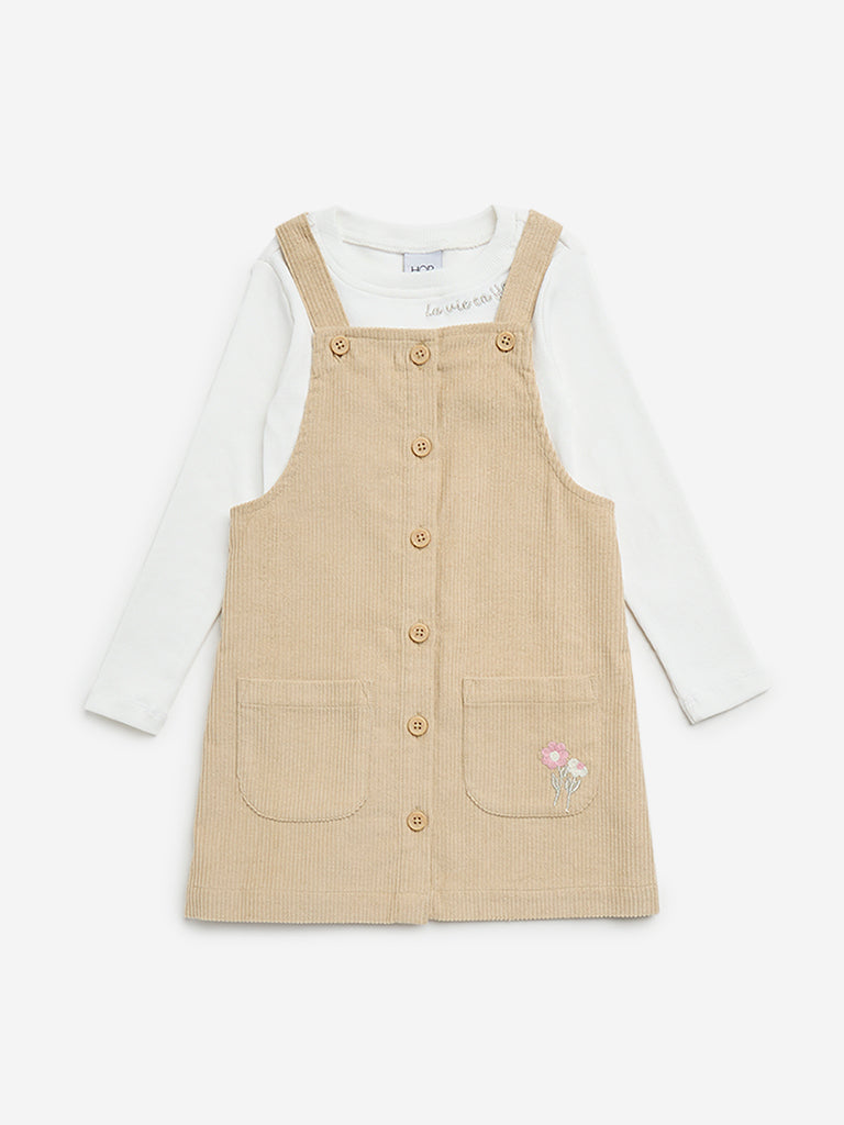 This beige set by HOP kids features a pinafore and solid white t-shirt. Designed with a corduroy finish, the pinafore is fitted with a button placket and adjustable straps. The t-shirt highlights text designs and is complemented by a crewneck and full sleeves.
