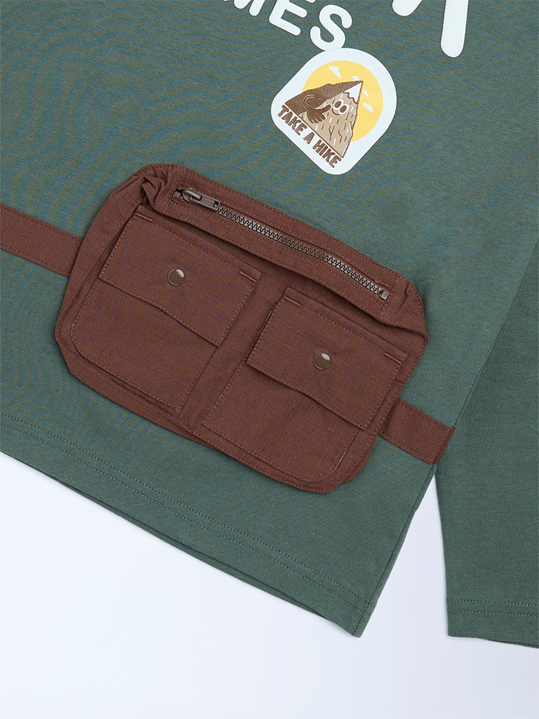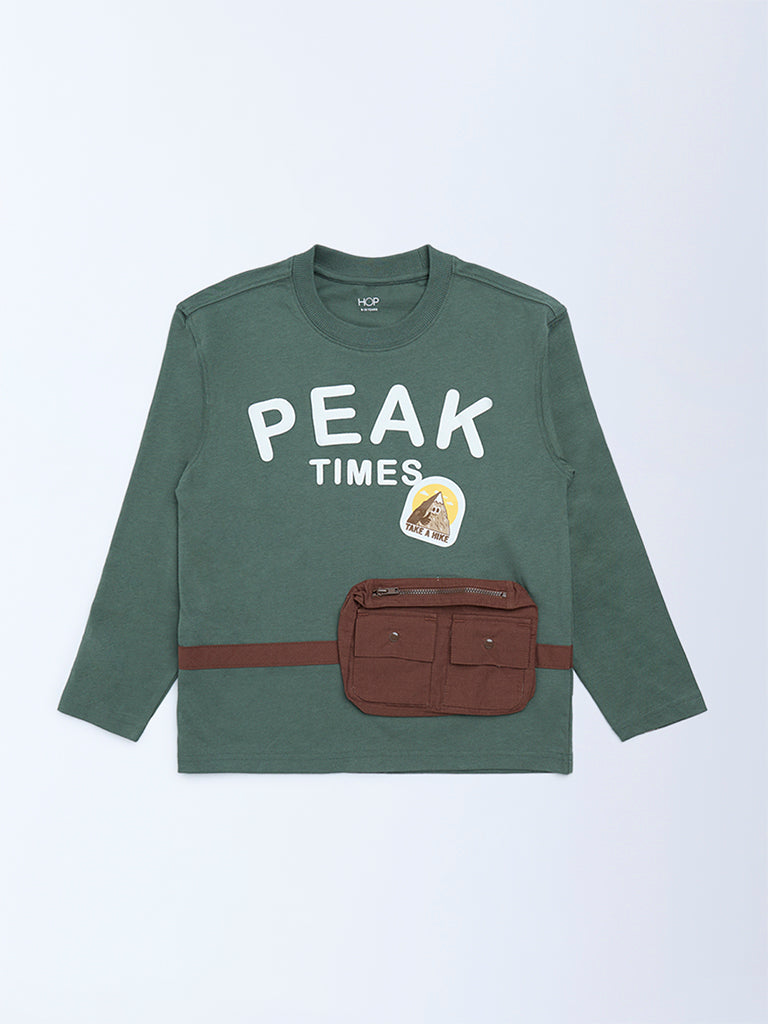 HOP Kids brings an adventurous edge to casual dressing with this green t-shirt. Crafted from pure cotton fabric, it features a crew neck and full sleeves for a minimal silhouette. The front showcases playful text prints along with a functional pouch detail, making it a fun choice for outdoor-inspired looks.