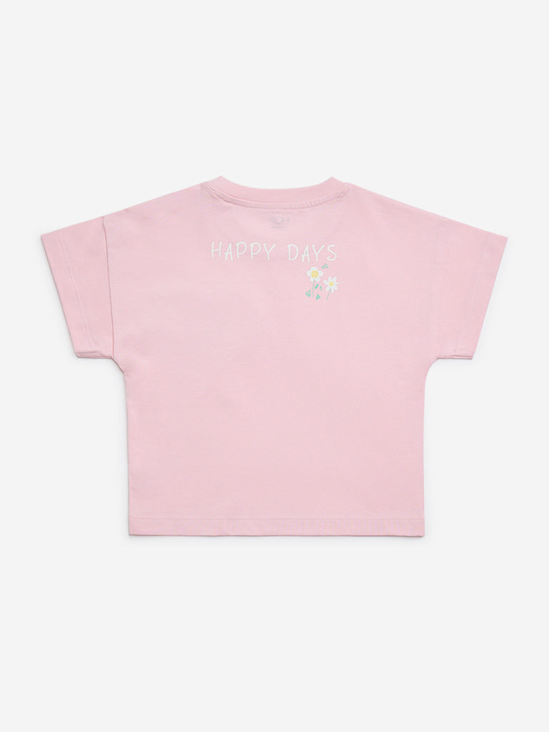 HOP Kids introduces this pink t-shirt, crafted from a cotton-rich fabric for all-day comfort. Accented with a heart-embroidered motif, it features a round neck and short sleeves, making it a charming and easy-to-style choice for everyday wear.