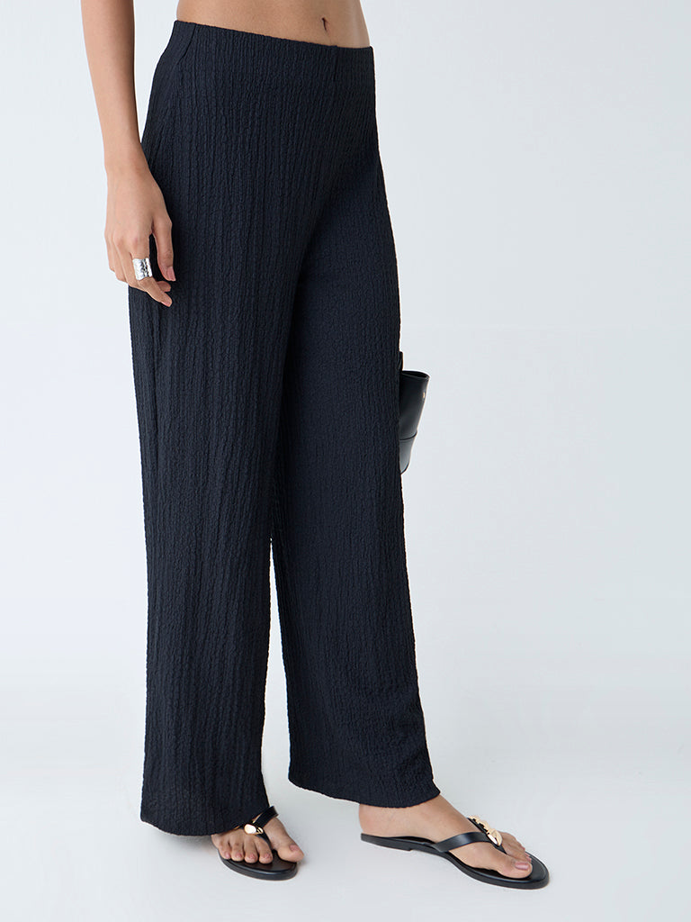 These black trousers from LOV are cut from a crinkle-textured fabric that adds quiet depth to a clean silhouette. The smooth elasticated waistband slips on with ease, offering comfort without compromising shape.