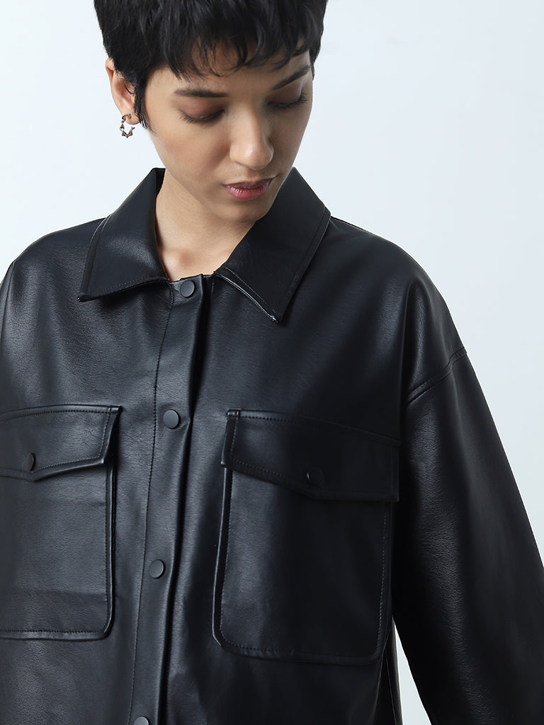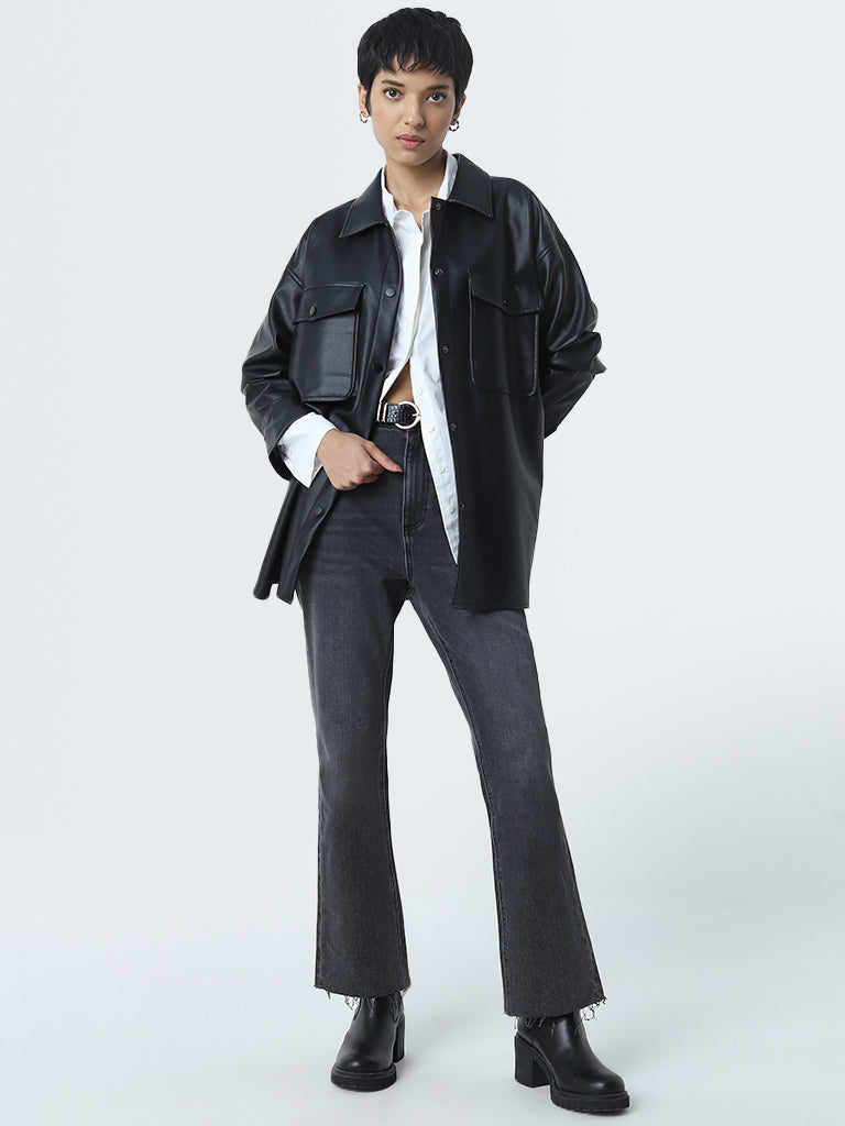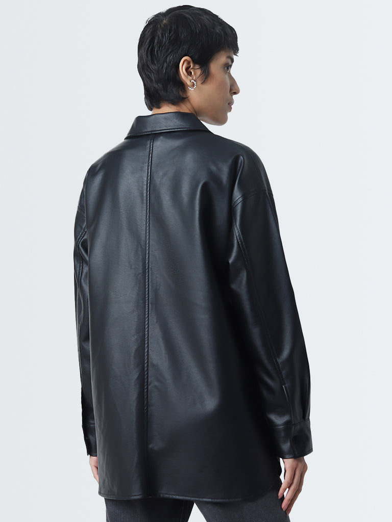 This black jacket from LOV is fashioned with a faux-leather finish. Crafted from a breathable fabric, the versatile separate is fitted with a collar that extends to a button placket and full sleeves. The flap pockets lend a functional bonus.