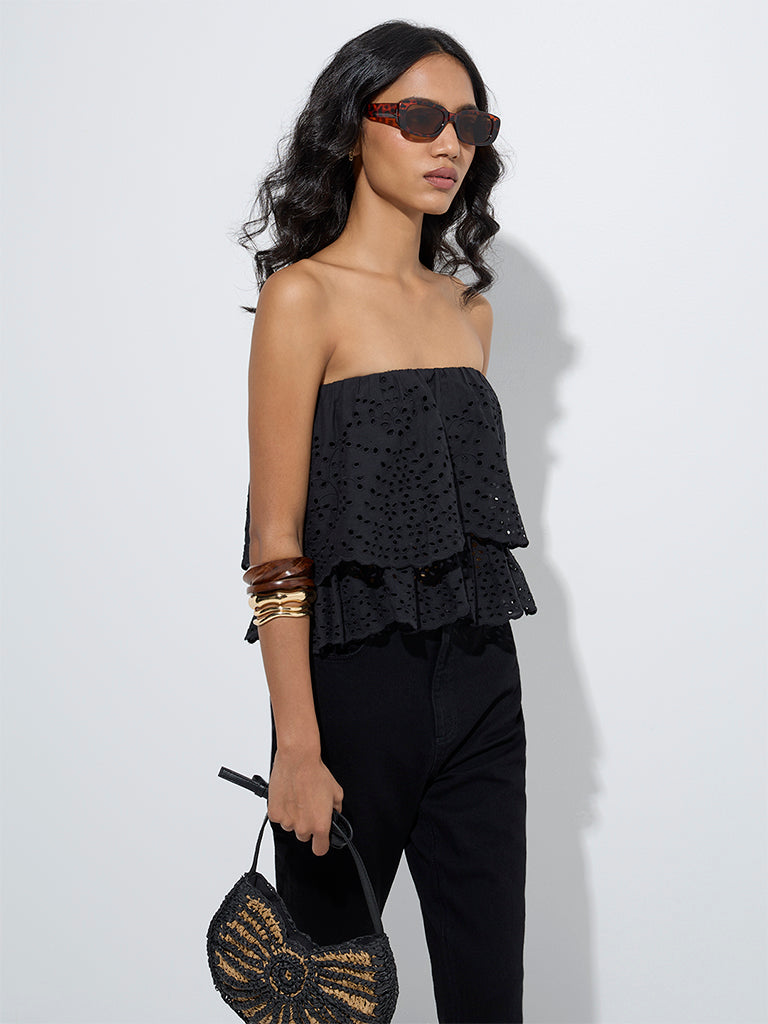 This black top from LOV highlights intricate schiffli designs, bringing delicate charm to your wardrobe. Created from pure cotton, it features ruffle detailing that add movement and femininity.