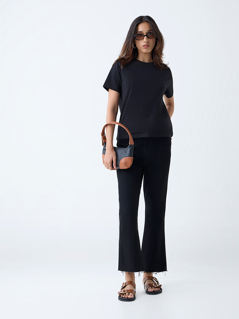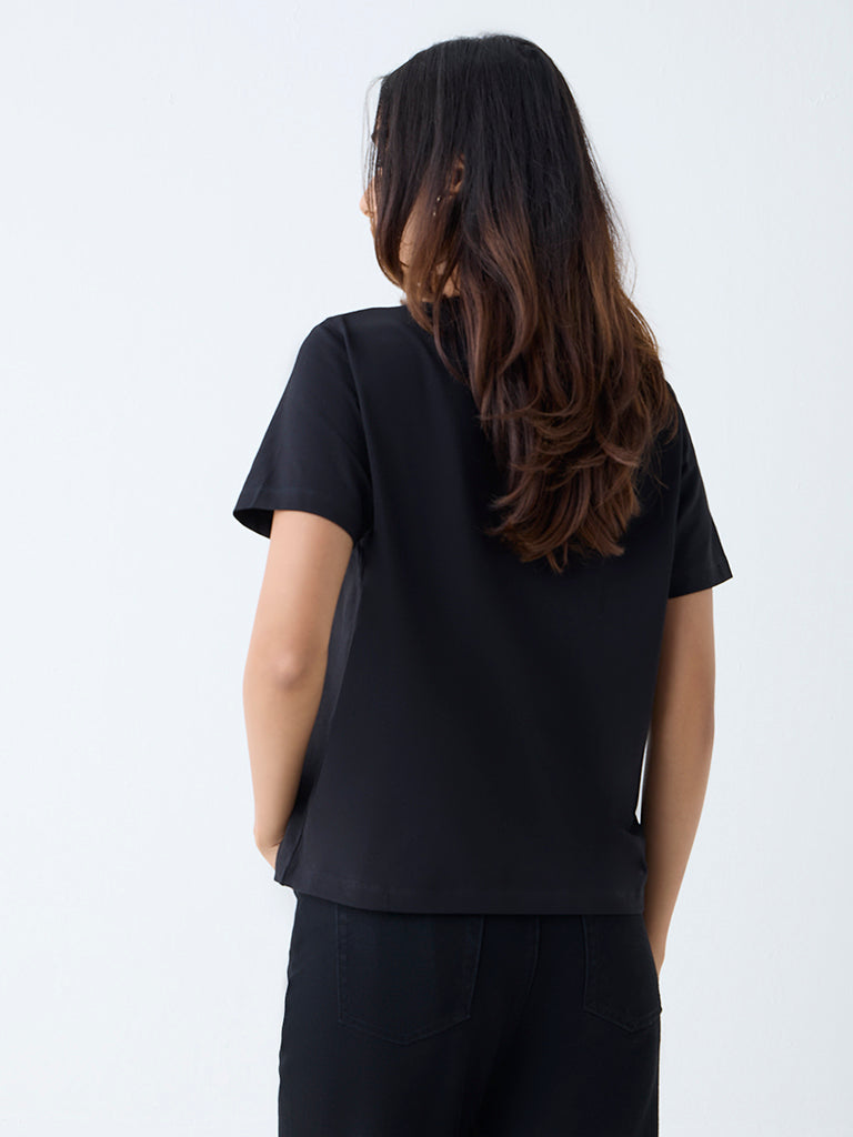 This black tee from LOV is spun from pure cotton for all-day wear. The minimal profile is styled with a ribbed round neck and half sleeves, offering a timeless silhouette that pairs effortlessly with tailored separates or off-duty denim.