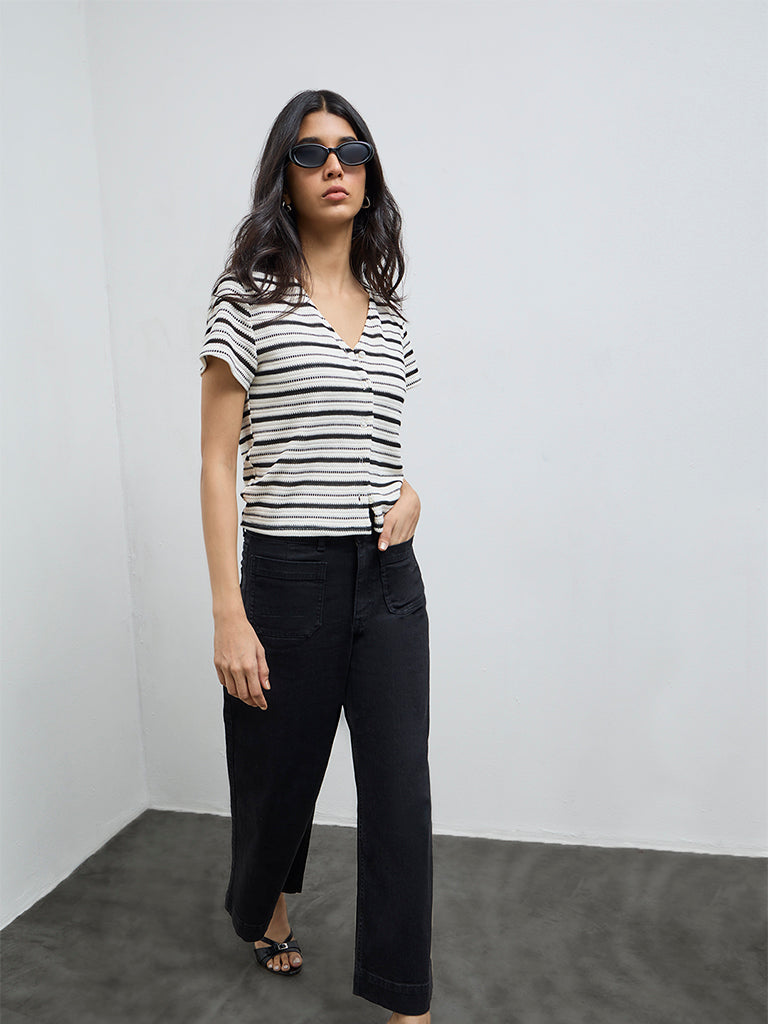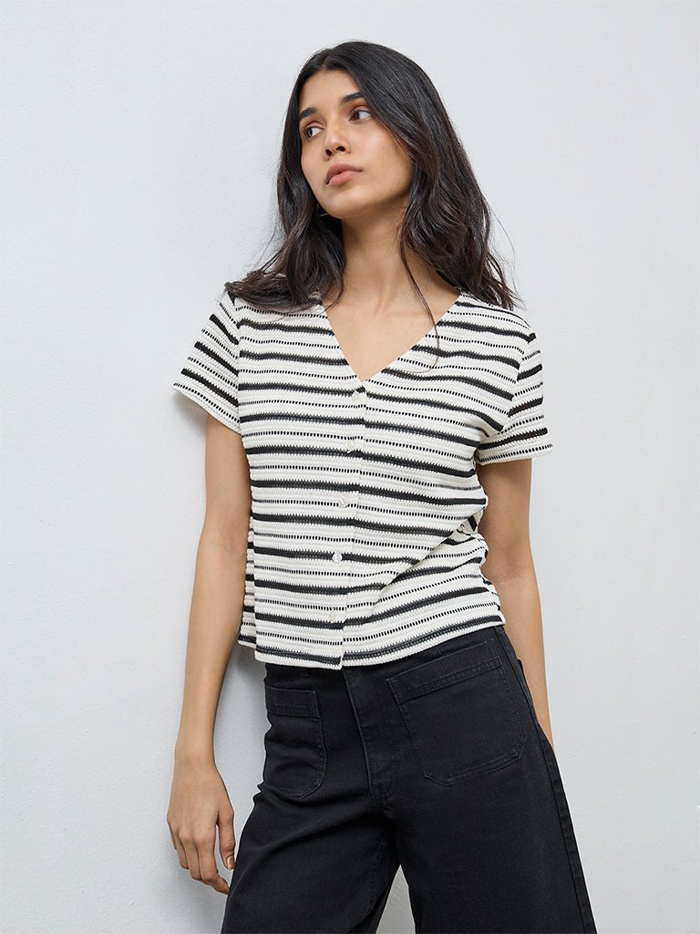 LOV presents this off-white and black striped knit-textured V-Neck top, designed with a sleek button-up front for a clean, modern finish. Crafted from a comfortable cotton blend fabric, it offers ease through the day. Style it effortlessly with jeans, tailored pants, or skirts for a versatile addition to everyday wardrobes.