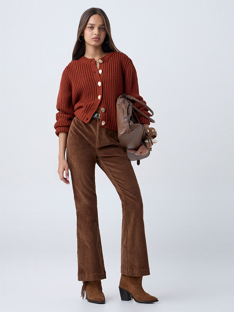 These brown corduroy trousers from LOV blend classic texture with a modern fit. Crafted from a soft cotton-blend fabric, they’re shaped in a flattering bootcut silhouette that elongates the frame. The buttoned waistband, belt loops, and practical pockets complete the design with a versatile finish.
