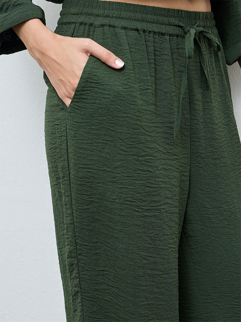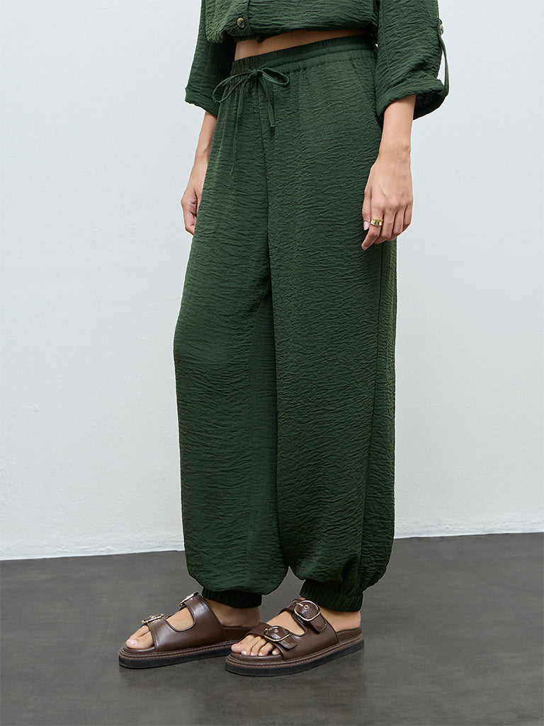 These dark green pants from LOV are crafted from premium crinkle-textured fabric. The high-rise waist is elasticated with adjustable drawstrings for a secure fit. Designed with regular side pockets for utility and ease, the elasticated hemlines ensure a snug finesse.
