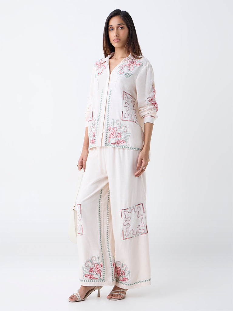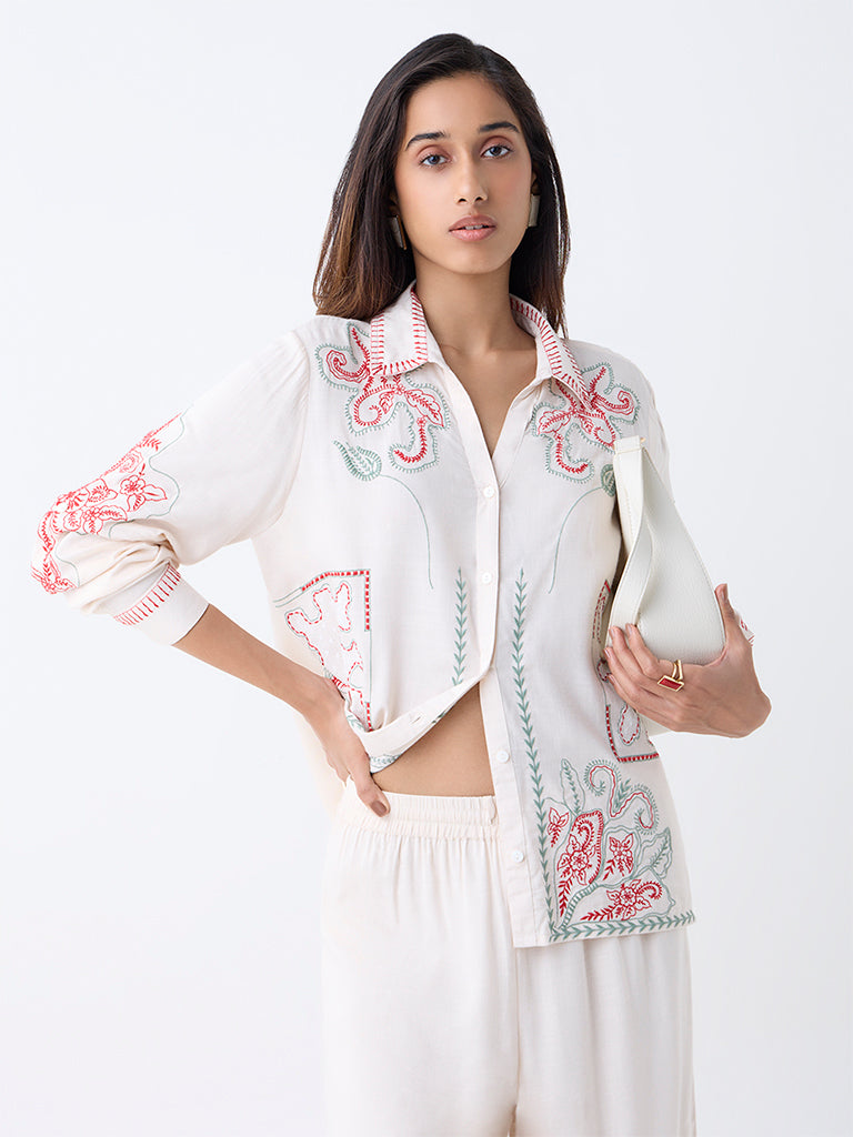 This off-white shirt from LOV brings quiet elegance to everyday styling. Detailed with intricate embroidery, it’s crafted from breathable fabric and finished with a collared neckline, button placket, and softly tailored sleeves. A timeless piece that complements both festive skirts and modern workwear.