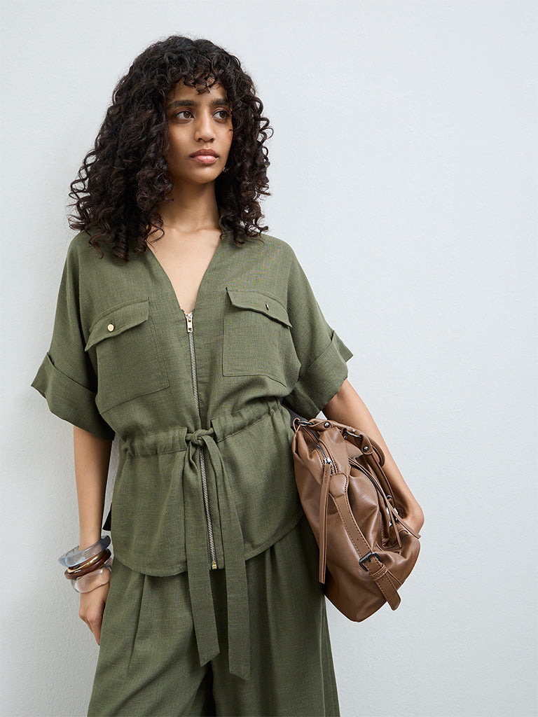 LOV presents this olive blouse crafted from a premium cotton-blend fabric is designed in a front-open silhouette for a contemporary appeal. The notched, plunging neckline extends into a golden zipper placket, adding a refined metallic accent. Styled with short dolman sleeves and two chest flap pockets with golden buttons, it features an elasticated waist with a matching belt.