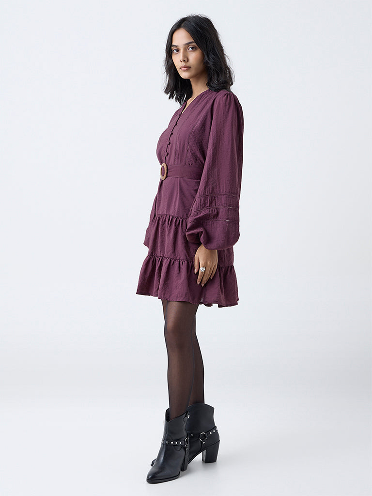 Graceful and feminine, this plum dress from LOV is crafted from lightweight fabric that drapes beautifully in a tiered silhouette. The lace-detailed bodice, v-neckline, and balloon sleeves lend soft texture, while the matching belt defines the waist for a balanced shape. An elegant pick for warm days and easy occasions.