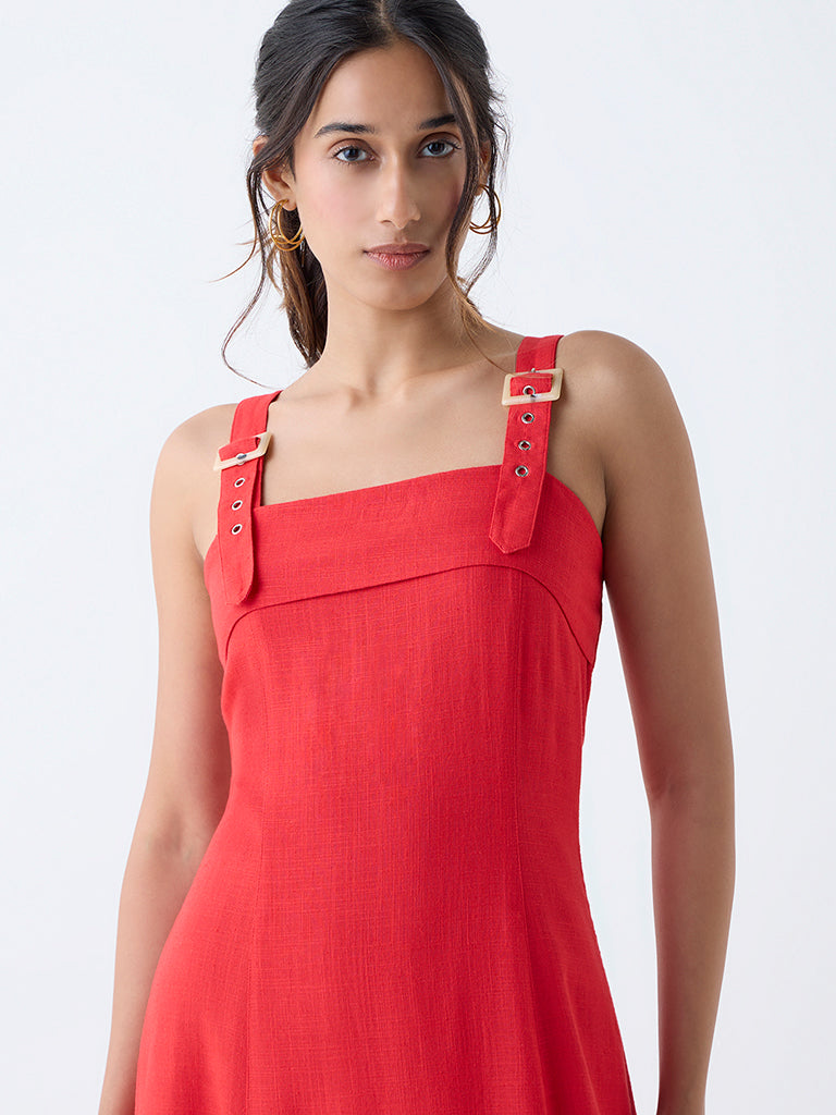 Step into elegant simplicity with this red dress from LOV, beautifully crafted from a sumptuous fabric. Shaped in a flattering A‑line silhouette, it drapes effortlessly from the waist for a feminine look. The square neck and buckle‑detailed shoulder straps add structure and subtle flair, while the solid hue offers a bold look.