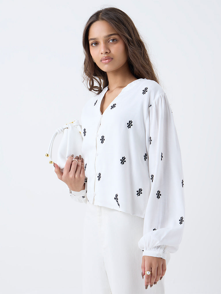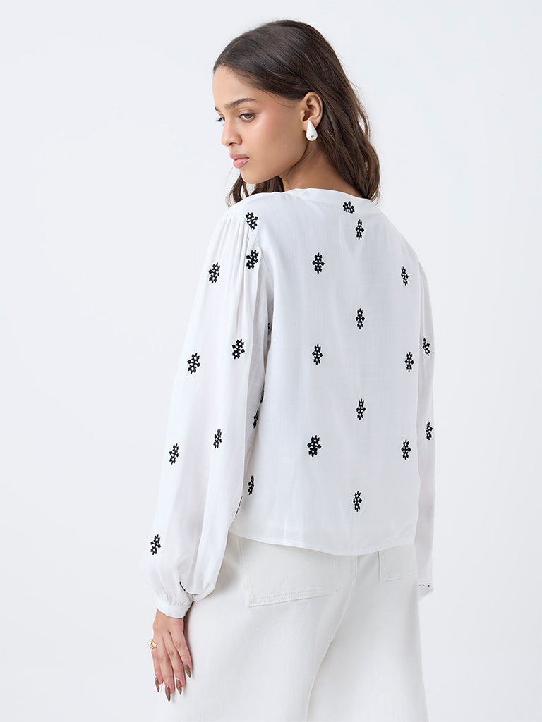 Designed for slow mornings and sunlit plans, this white blouse from LOV brings effortless polish to warm-weather dressing. Delicate embroidery runs throughout, adding texture without feeling heavy. Crafted from a breathable fabric, it features a mandarin neckline that flows into a button placket, while balloon sleeves lend a relaxed shape.