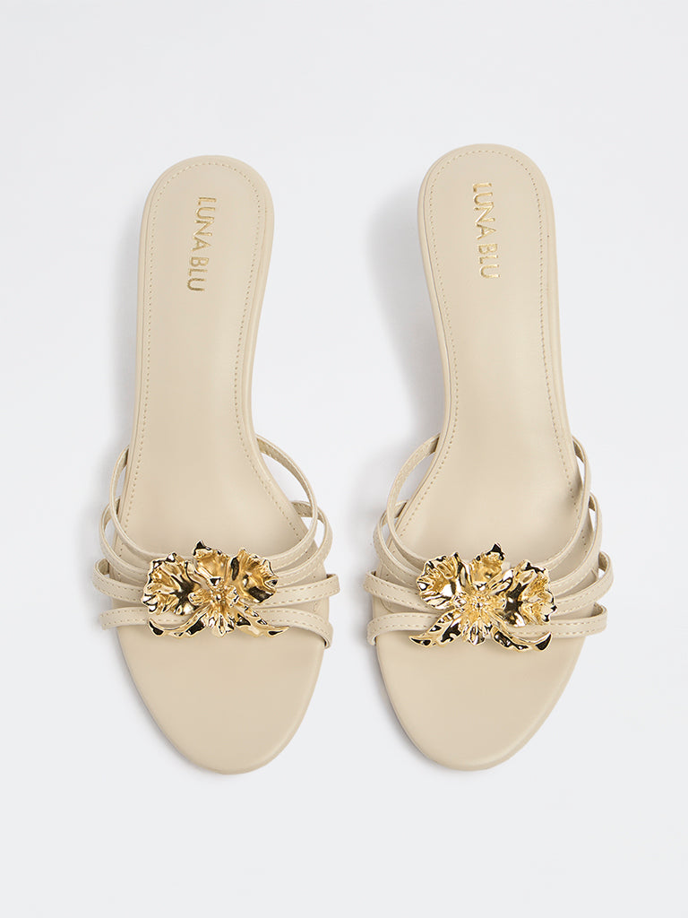 These ivory heel sandals from Luna Blu is set to bring a polished touch to summer dressing. The upper features slender straps arranged in a clean, open layout, centred by a sculpted metallic floral embellishment that adds a striking focal point. A mid-height heel offers gentle lift, while the soft footbed supports comfortable wear. Finished with a textured outsole for steady grip, this pair complements both daytime outings and evening occasions.