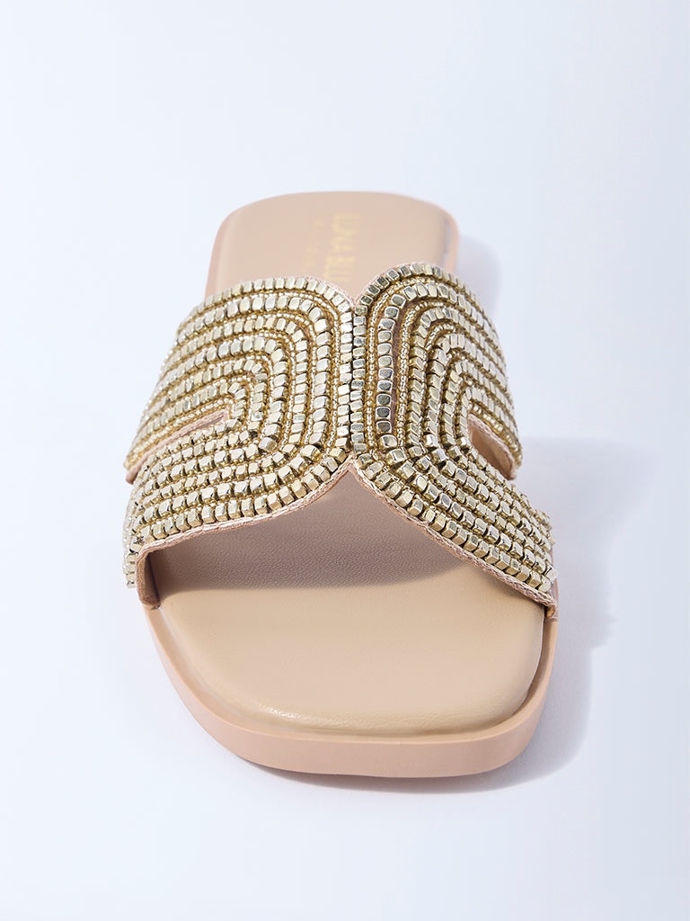 Revamp your festive style with these light gold slides from Luna Blu. Intricate beadwork adorns the wide front strap for a luminous touch, while the square toe and cushioned footbed keep the look elegant yet effortless.