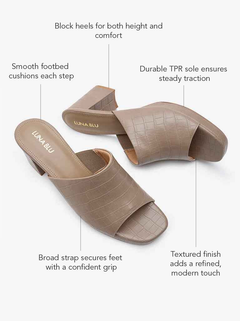 These taupe textured sandals from Luna Blu are designed with block heels and a smooth footbed for a comfortable walking experience. The broad strap ensures a firm grip.