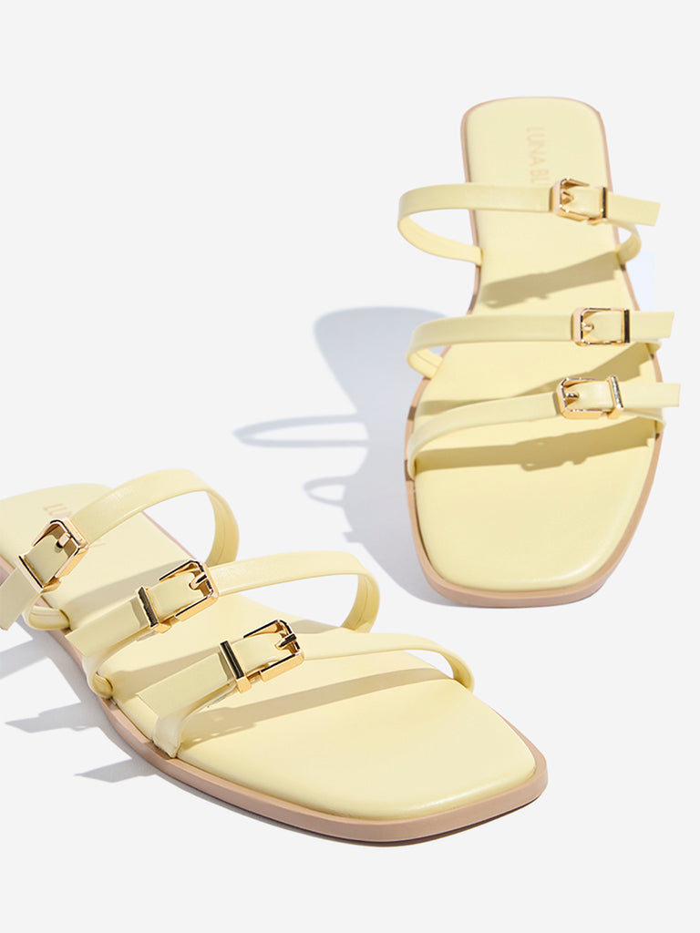These yellow sandals from Luna Blu are designed with multiple straps accented by buckle details for a sleek, polished finish. Crafted for everyday comfort, they feature a cushioned footbed and a textured outsole that provides a reliable grip with every step.