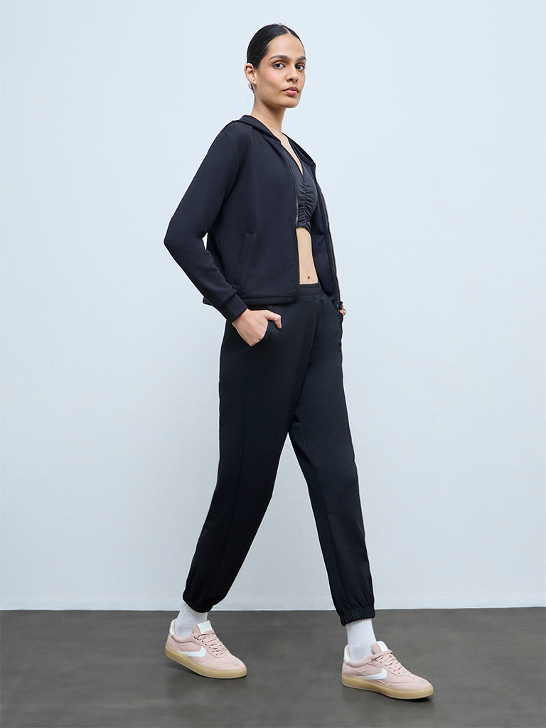 Designed for versatile layering through changing routines, this black hooded jacket from Nuoflexx offers warmth with a streamlined feel. Made from soft, premium fabric, it features a full zip front, full sleeves and kangaroo pockets for everyday utility.