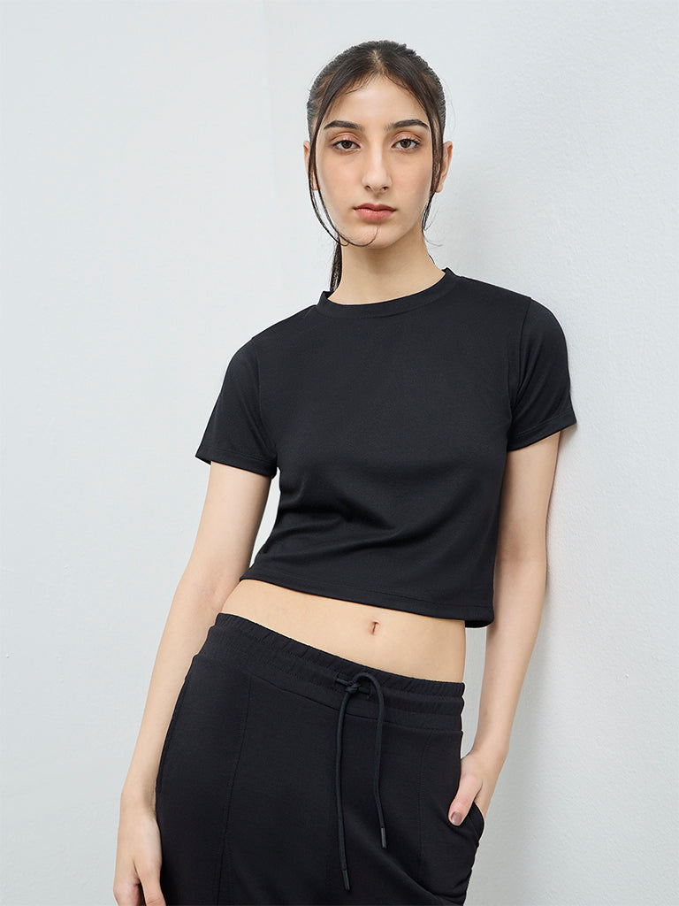 This solid black t-shirt from Nuoflexx is designed with a classic round neckline and short sleeves for a clean, versatile look. Crafted from soft, breathable fabric, it delivers all-day comfort while keeping your athleisure style effortless and understated.