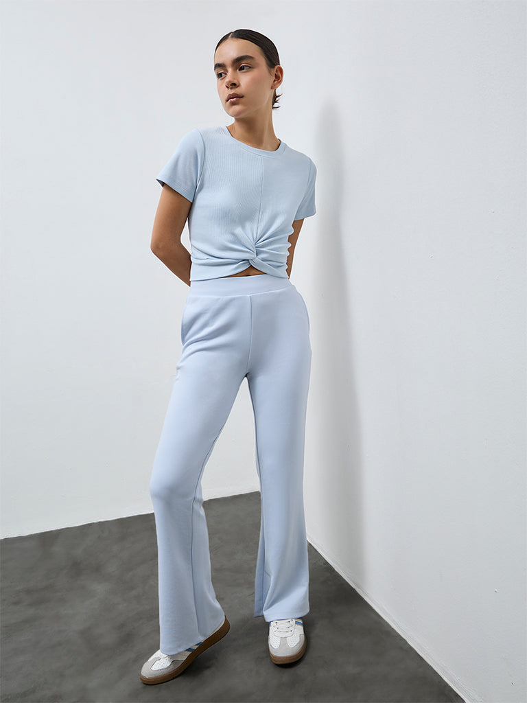 This light blue cropped t-shirt from Nuoflexx brings a fresh update to everyday athleisure. Designed with a knotted detail at the center waist along the hemline, it adds subtle shape to the silhouette. Crafted from textured fabric with a classic crew neckline and short sleeves, it is an easy pick for pairing with joggers, leggings or high-rise pants.