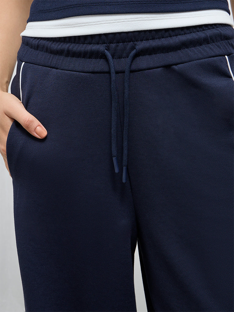 Built for days that move from workouts to wind-downs, these navy track pants from Nuoflexx priorities comfort without losing style. Designed with an elasticated waist and adjustable drawstrings for a secure fit, they feature white piping along the sides for a sporty edge. Regular side pockets add everyday practicality, while the premium soft, stretchable fabric keeps things effortless.