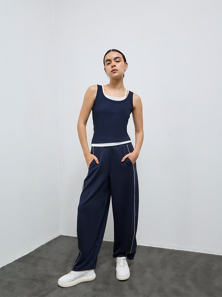Nuoflexx presents this navy tank top accented with white textured lining for a clean contrast. Designed with a round neckline and a sleeveless, streamlined silhouette, it is crafted from premium stretchable fabric for lasting comfort.