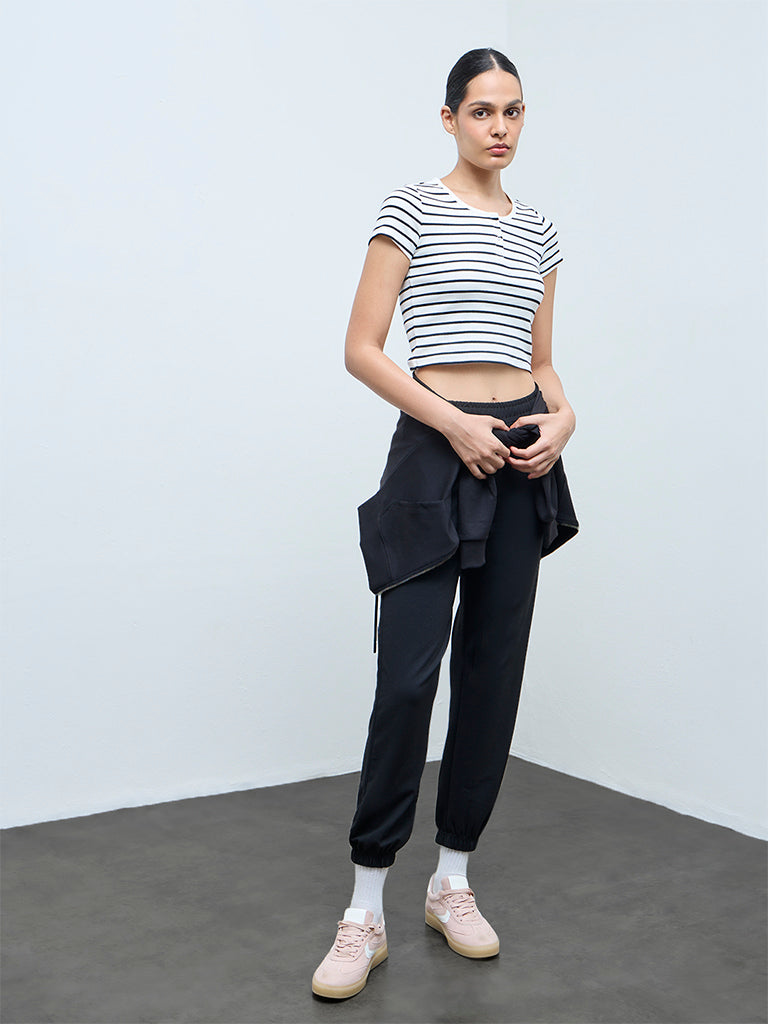 This white striped T-shirt by Nuoflexx is crafted from a soft, textured cotton-blend fabric for breathable, all-day comfort. Featuring a round neckline and short sleeves, it offers a classic, easy-to-wear silhouette. The crop length adds a trendy touch, making it a versatile piece perfect for casual styling or pairing with high-waist bottoms.