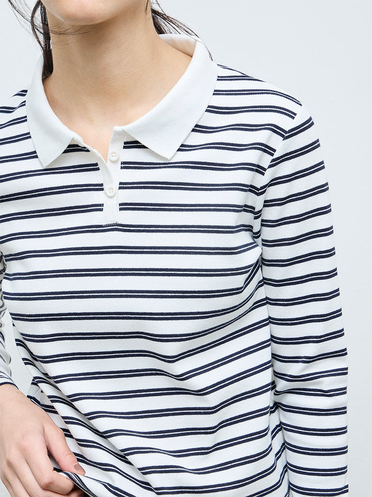 A sporty classic with a polished twist, this white striped textured T-shirt from Nuoflexx elevates everyday dressing. Featuring a contrasting solid white spread collar and a notched neckline that extends into a quarter-button placket, it delivers a clean, contemporary look. Designed with full sleeves and crafted from a premium cotton-blend fabric, it offers both structure and comfort.
