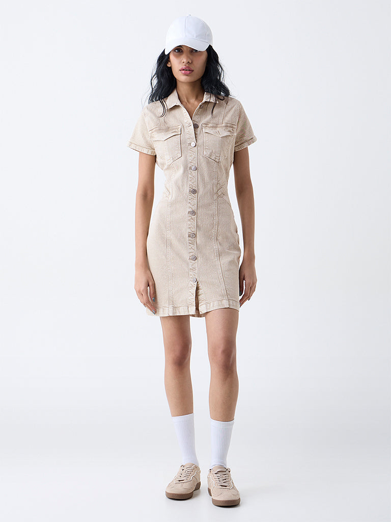 Channel modern ease in this beige washed denim dress from Nuon. Made from pure cotton, it is styled with a button placket, chest pockets, and short sleeves, creating a piece that’s equal parts trendy and versatile.