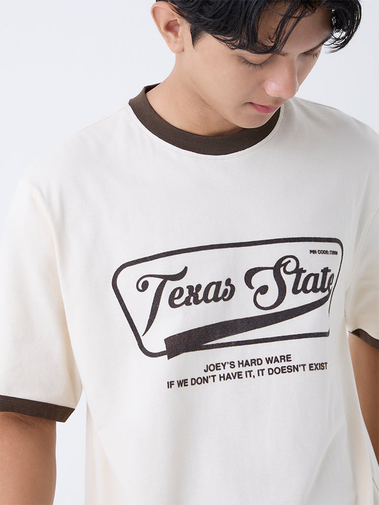 Refresh your casual rotation with this beige t-shirt from Nuon. Designed with a classic round neck and short sleeves, it features embossed typography that lends a subtle yet striking detail. Crafted from soft fabric, it delivers all-day comfort while keeping your look effortlessly modern.