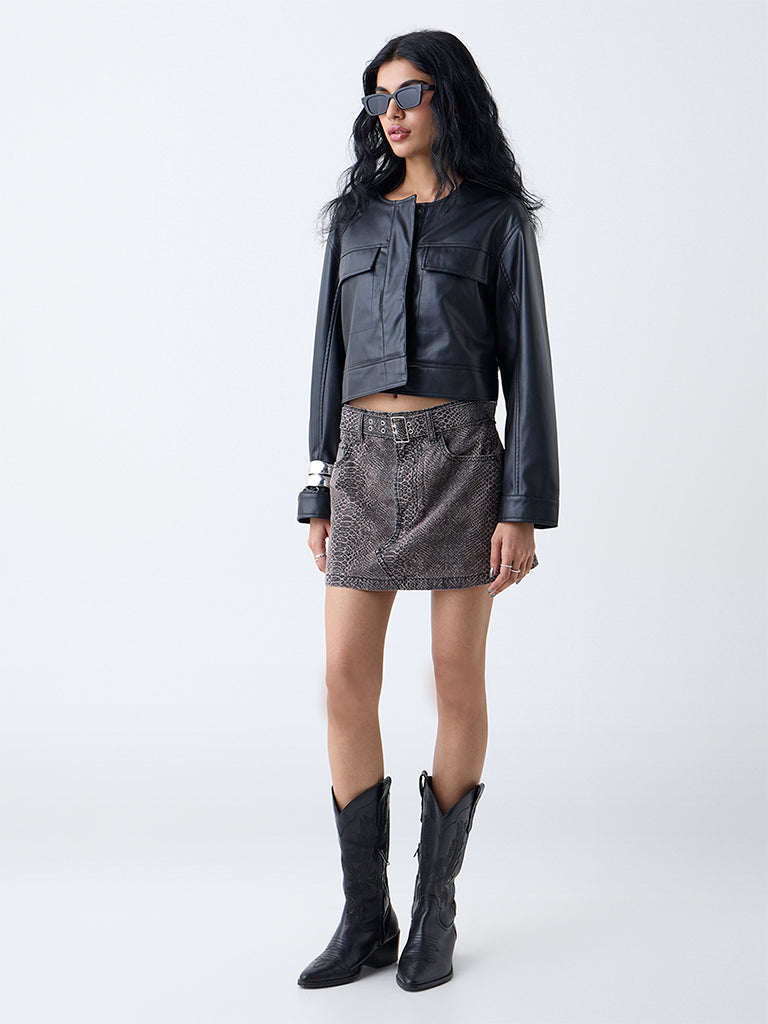 Nuon takes the classic black mini skirt and turns up the volume with an animal-print finish. A belted high-rise fit sharpens the silhouette, while pockets add street-ready ease. Pair it with boots and confidence — that’s all you need.