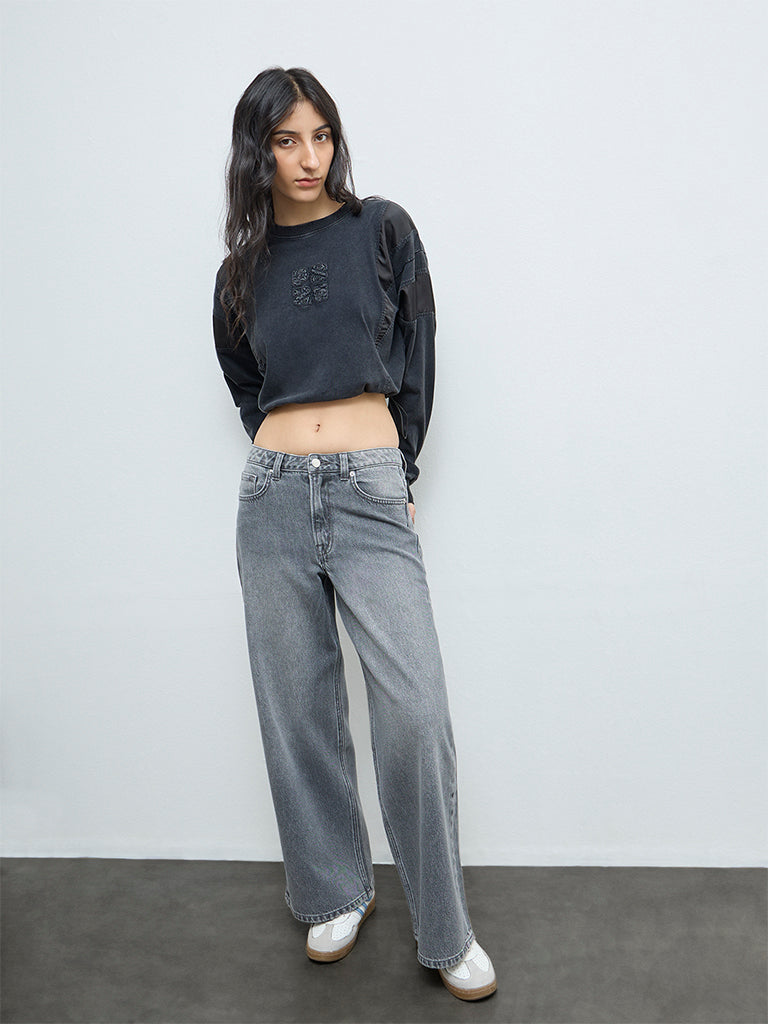 Channel effortless street energy with this black t-shirt from Nuon, crafted from a denim-inspired fabric that adds subtle texture. Printed detailing across the front brings visual interest, while the crew neckline and full sleeves keep it relaxed. An elasticated drawstring waist shapes the fit, making it easy to style for casual days or late-evening plans.