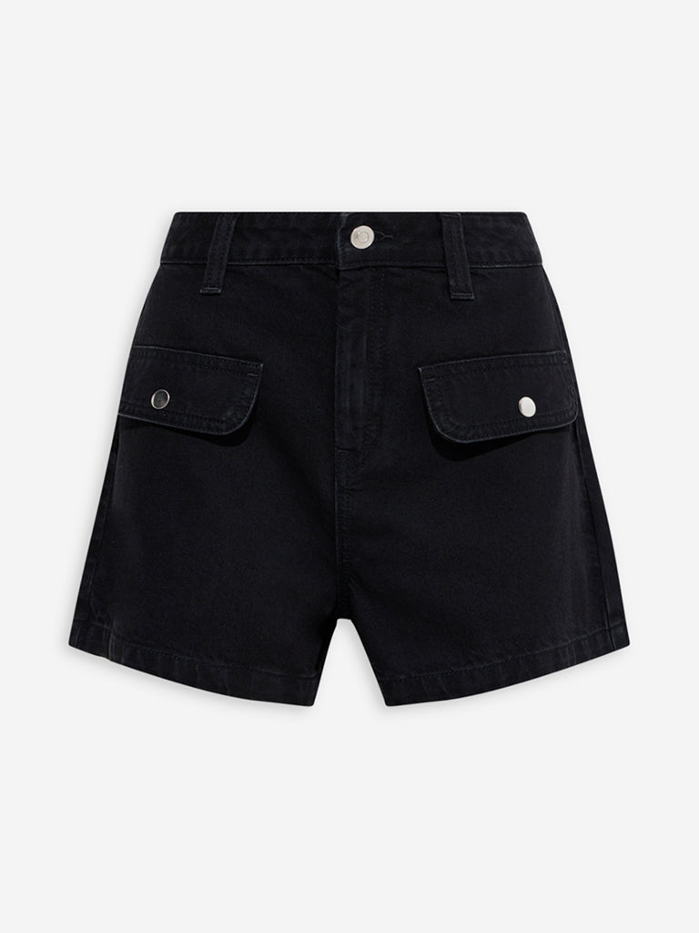 These black denim shorts from Nuon are spun from pure cotton fabric for a sturdy yet comfortable feel. Designed with a buttoned waist, zipper closure, and belt loops for a secure fit, they're finished with imitation flap pockets that add a touch of detail to the look.