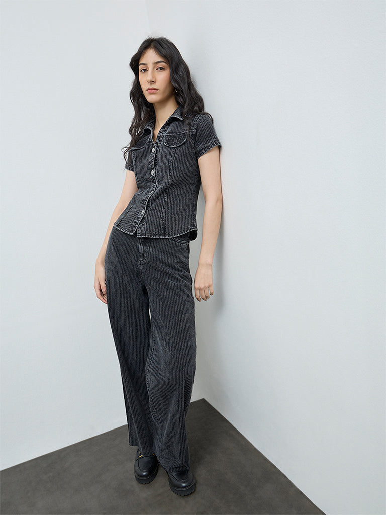 Add structure to casual looks with this black denim shirt from Nuon, crafted from cotton-rich fabric with subtle self-striped detailing. A classic collar, metal button placket, and short sleeves lend a clean, utility-inspired finish, while imitation pockets add edge without bulk.