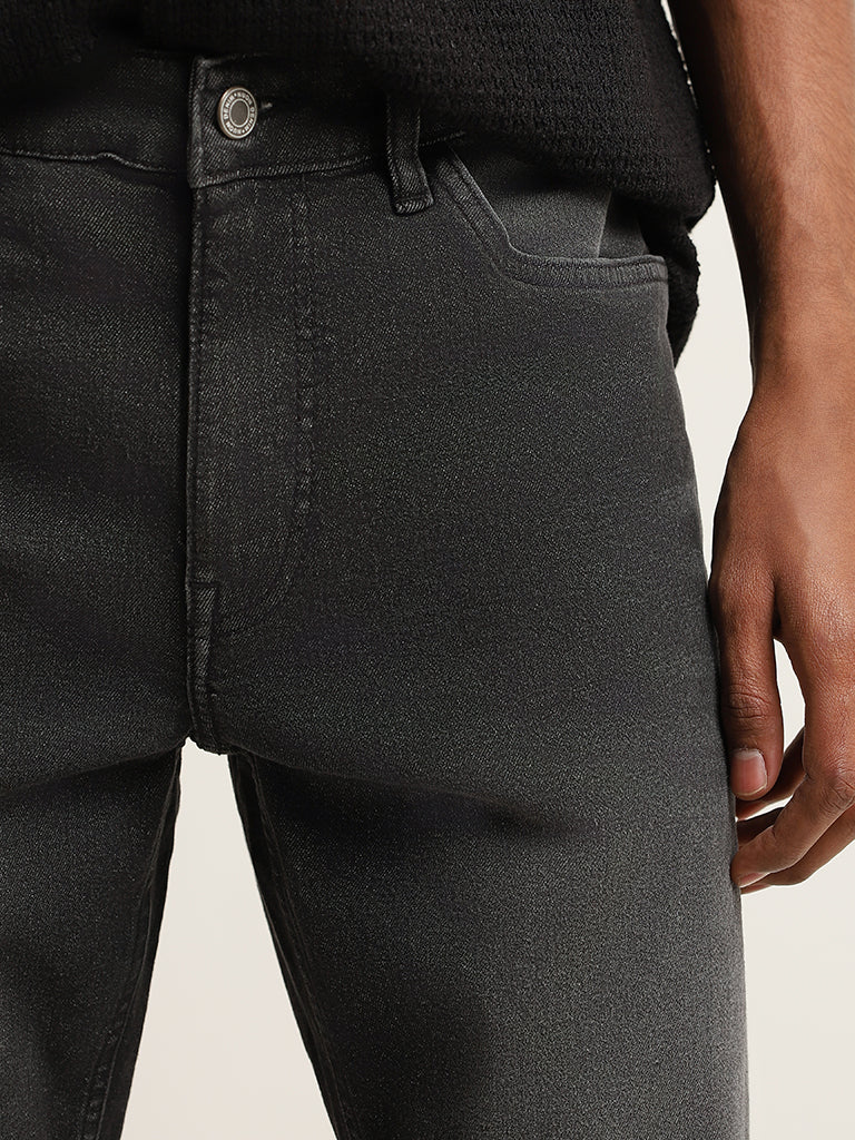 Black straight-fit jeans with five pockets, mid rise, faded effect, front button fastening by Nuon.