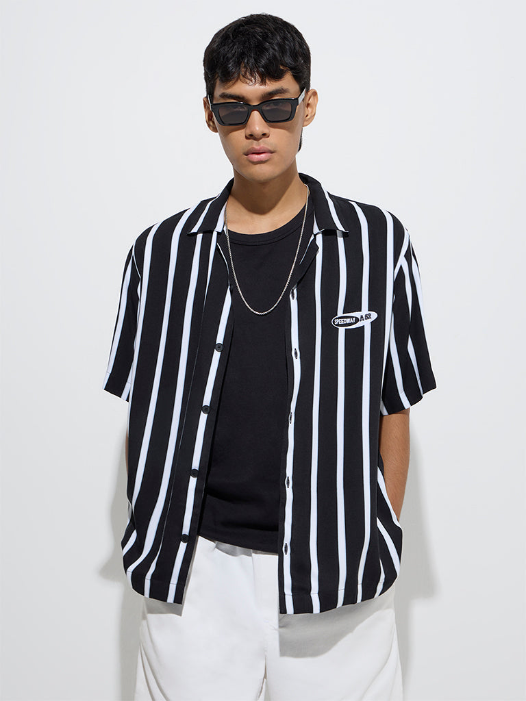 This black shirt from Nuon makes a sharp statement with its timeless stripe prints and easy-going silhouette. Shaped in a relaxed fit, it features a camp collar, half sleeves, and a button-up front. The breathable fabric keeps things cool and comfortable through day-long plans.