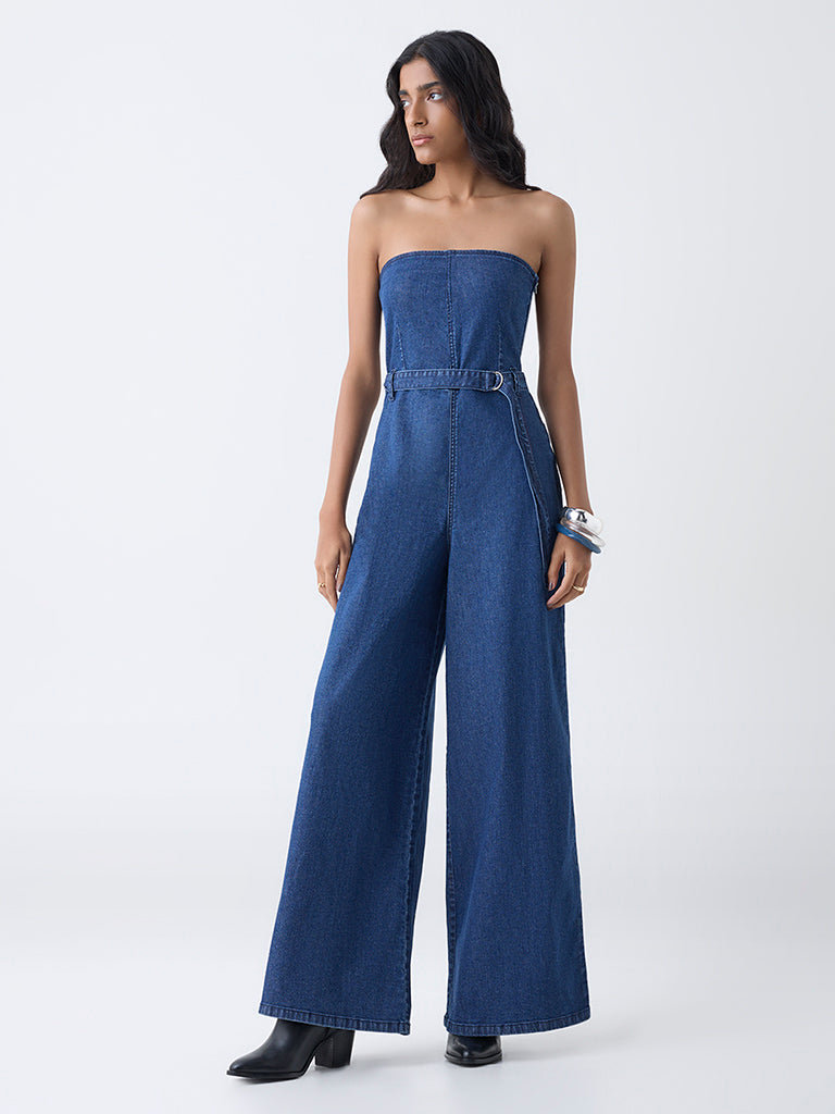 A statement in denim, this blue jumpsuit from Nuon blends structure with ease. Crafted from breathable fabric, it features an off-shoulder neck and a wide-leg silhouette for a flattering shape. Complete with belt loops, a matching buckle belt and a back zipper, it’s a stylish choice for effortless day-to-night dressing.