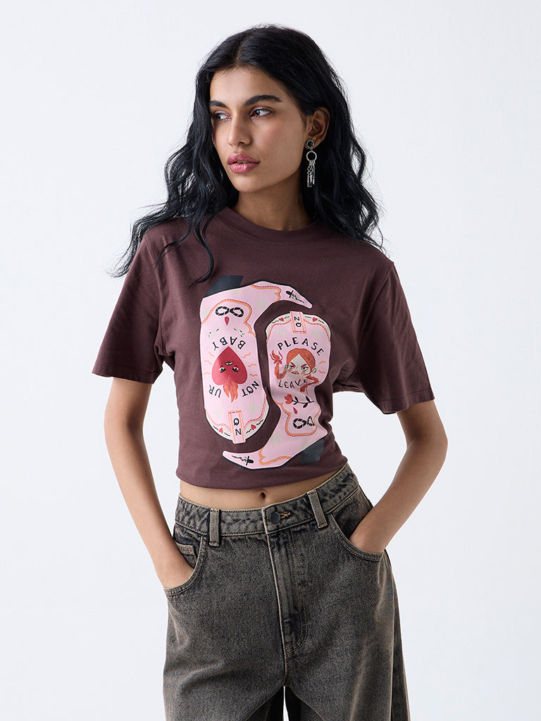 Nuon Brown Printed Cotton-Blend T-Shirt