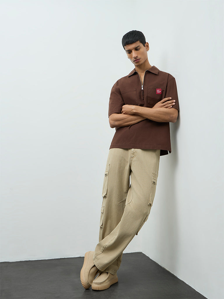 This brown t-shirt from Nuon is made from pure cotton, delivering a breathable feel suited to extended wear. The relaxed fit is shaped with a regular collar, a brief zip-front opening and short sleeves. It is completed with twin chest pockets, finished with a small patch detail.