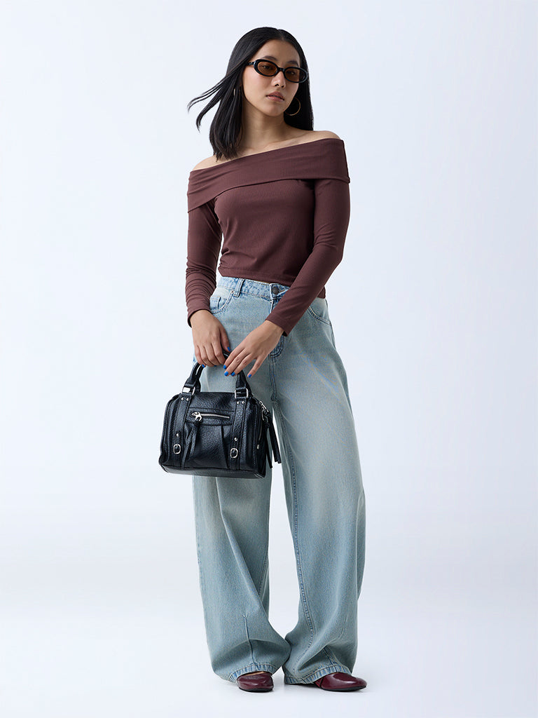 This brown top from Nuon brings effortless charm to everyday style with its ribbed texture and off-shoulder neckline. Woven from an ultra-lightweight fabric, it’s designed with full sleeves that balance coverage and flair.