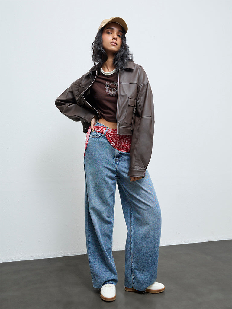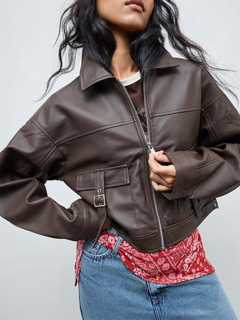Nuon presents this dark brown jacket, showcasing a structured and contemporary profile. It is framed with a crisp collar, a zipper front and drop-down sleeves, while the envelope pockets with buckle details that elevates the overall design. The premium-blend fabric offers a comfortable yet polished feel, making it a versatile layering option for both casual and elevated looks.