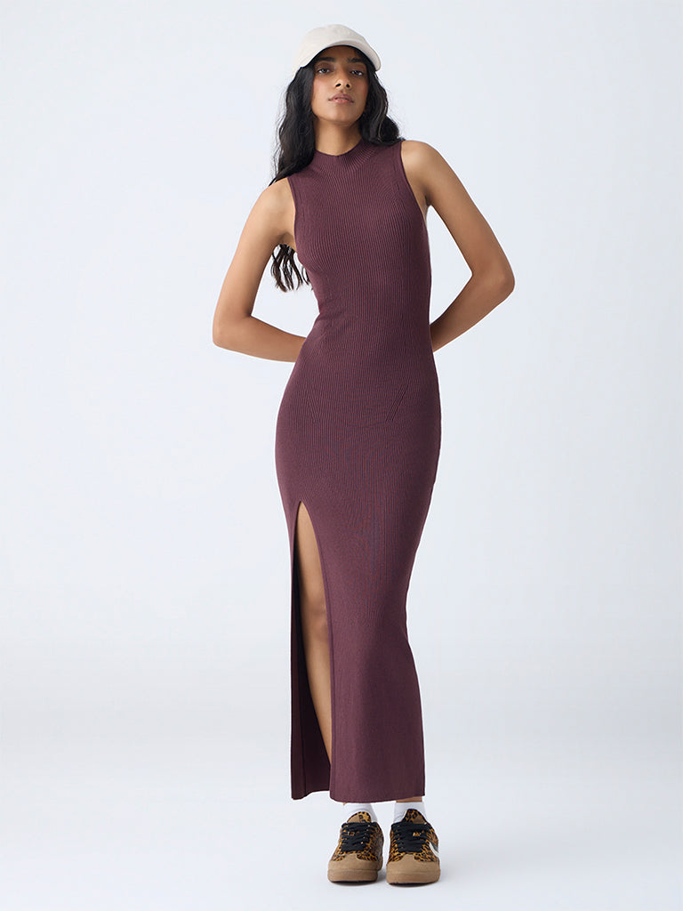 Sleek and effortlessly cool, this dark brown ribbed dress from Nuon is made from a soft, stretchable fabric that hugs in all the right places. The high neckline and sleeveless cut give it a contemporary edge, while the slit across the front adds just the right touch of attitude.
