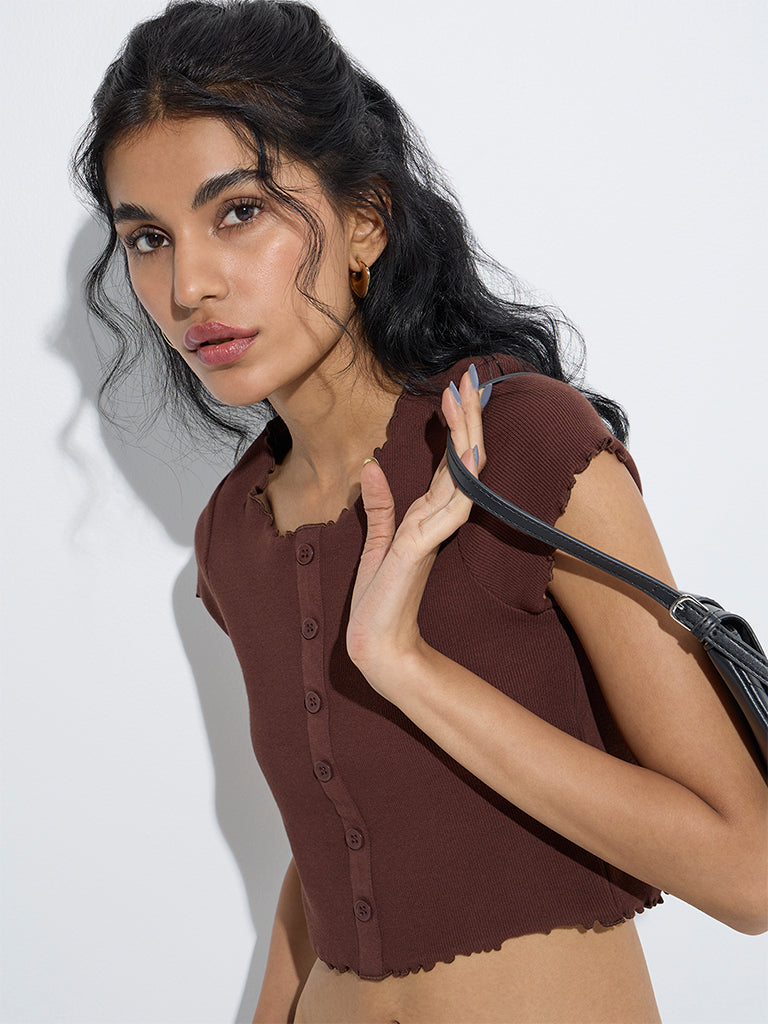 This dark brown top from Nuon is styled in a ribbed profile for a soft, form-flattering feel. Designed with a crewneck, it features a button placket and short sleeves, making it a versatile pick for your off-duty looks.